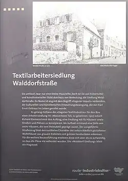 Riemerschmid erhielt 1907 von Osthaus den Auftrag zur Planung der Siedlung mit insgesamt 87 Arbeiterwohnhäusern und Gemeinschaftseinrichtungen wie Kindergarten und Betreuerwohnung sowie der zugehörigen Straßen und anliegenden Plätze. Die stark vom Heimatstil geprägten unterschiedlichen Haustypen der Arbeitersiedlung Walddorf mit rustikalem Charakter wurden aus dem grauen Kalkstein der unmittelbar angrenzenden Steinbrüche errichtet. Abwechselnd sind die Häusergiebel und Traufen der Straße zugewandt. Ein rückwärtiger Garten zur Selbstversorgung gehört zu jedem Haus.