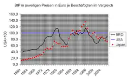 Die USA hatten 2001 ein höheres Produktionsniveau pro beschäftigte Person als die anderen Industriestaaten. Das hohe Wachstum der US-amerikanischen Arbeitsproduktivität ist die Folge des raschen technologischen Wandels der 1990er Jahre. So bewirkte der vermehrte Einsatz von Computern und Robotern, Computerrevolution genannt, neue Wachstumsmöglichkeiten. Generell lässt sich sagen, dass der zunehmende Einsatz von Informations- und Kommunikationstechnologien die Arbeitsproduktivität pro Erwerbstätigen und pro Arbeitsstunde weiter steigern wird, obwohl dies nicht tatsächlich auf qualifiziertere Erwerbstätige, sondern auf die zunehmende Automatisierung von Arbeitsprozessen zurückzuführen ist.[20] In den Jahrzehnten davor war das Wachstum in den USA viel geringer als in anderen Industrieländern. Von 1974 bis 2001 war es in den Industrieländern allgemein kleiner als von 1960 bis 1973. Japan hatte von 1960 bis 1991 die höchste Wachstumsrate der Arbeitsproduktivität, gefolgt von Deutschland und Frankreich. Das Wachstum in den USA war im Vergleich zu den übrigen großen Wirtschaftsmächten am niedrigsten und ging Mitte 2016 drei Quartale in Folge zurück.[21] Dies lässt sich teilweise auf Unterschiede der Investitionsraten und des Wachstums des Kapitalstocks in diesen Ländern zurückführen. Die höheren Wachstumsraten Japans, Deutschlands und Frankreichs resultierten aus dem Wiederaufbau nach dem Zweiten Weltkrieg, wobei ein hohes Kapitalwachstum eine Rolle spielte. Bei diesen Staaten fand also ein Aufholprozess statt.[22]