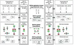 - Implementierungsebene: Während die ersten beiden Ebenen primär der Abstimmung zwischen menschlichen Akteuren oder der Generierung von Artefakten der Ausführungsebene dienen, sind die Artefakte der dritten Ebene auf Maschineninterpretierbarkeit ausgerichtet. Die hier erstellten Artefakte können dann zur Laufzeit, bei der Ausführung von organisationsübergreifenden Prozessen, verwendet werden. Dies sind beispielsweise WSDL-Beschreibungen von internen oder externen Services, XSD-Beschreibungen der ausgetauschten Datentypen oder BPEL-Beschreibungen der beteiligten Prozesse.