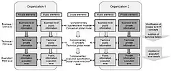 - Beschreibung der Elemente von interoperablen Informationssystemen sowie deren Beziehungen. Hier wird der statische Teil der Architektur beschrieben, bzw. ihre Struktur. Es wird insbesondere beschrieben, welche Informationssystem-Elemente Unternehmen an ihre Kooperationspartner kommunizieren müssen und wie diese öffentlichen Elemente optimal mit internen, privaten Elementen korreliert werden können; Beispiele für solche Informationssystem-Elemente sind fachliche Funktionen und Services, Nachrichten-Formate, Interaktions-Sequenzen sowie beteiligte Rollen.