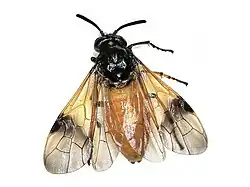 - Arge melanochroa – Die hinteren Femora der Pflanzenwespen sind schwarz; die Vorderflügel besitzen auf Höhe des Flügelmals einen schwarzen Fleck; der apikale Teil der Flügel ist transparent.[2]