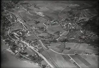 ![]() Luftbild auf Gorgier von Osten (1949); Bachlauf der Argentine in der unteren Bildhälfte von rechts nach links | ||
