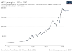 Bis etwa 1950 war Argentinien eines der reichsten Länder der Erde. Wirtschaftlich spielten traditionell die Landwirtschaft, Viehzucht und der Rohstoffabbau eine große Rolle, wenn auch heute der Dienstleistungssektor mit rund 60 % den größten Anteil am BIP ausmacht.