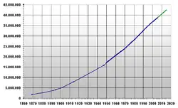 Argentinien hat eine Bevölkerung von etwa 46,2 Millionen Einwohnern (Stand: 2022).[12] Dies entspricht einer Bevölkerungsdichte von 16,4 Einwohnern/km². Etwa 87 % der Bevölkerung leben in Städten von mehr als 2000 Einwohnern, wovon allein 11,5 Millionen auf die Agglomeration Gran Buenos Aires entfallen. Diese hat eine Bevölkerungsdichte von 2989 Einwohnern/km². Die Stadt und die gesamte Provinz Buenos Aires zusammen haben 20,6 Millionen Einwohner, die Provinzen Córdoba und Santa Fe jeweils ca. dreieinhalb Millionen (Stand: 2022)[12], so dass in diesen drei im zentralen Teil des Landes gelegenen Provinzen zusammen circa 60 % der Bevölkerung leben. Weite Teile des übrigen Landes sind dagegen sehr dünn besiedelt, vor allem im trockenen Süden, wo nur etwa ein bis drei Einwohner/km² leben.