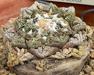 Die Pflanzen der Art bilden sukkulente, flach niedergedrückte bis kugelige Körper von 1,5 bis 10 cm Höhe und bis 10 (selten bis 15) cm Durchmesser mit großen, sukkulenten Rübenwurzeln. Sie bleiben fast immer unverzweigt. Die Körperfarbe ist meist graugrün, doch besonders die flachen Formen werden im Alter gelblich bis bräunlich. Die spiralig verteilten Warzen sind abgeflacht dreieckig bis rhombisch und überlappen sich teils. Die hornig verhärtete Oberseite jeder Warze ist durch eine ausgeprägte Furche, die Areole und Axille verbindet, fast durchgehend gespalten und quer dazu zerfurcht. Durch die den Furchen entspringende Wolle, die anfangs strohblond ist, dann nachdunkelt und schließlich vergraut, sind die Scheitel der Pflanzen gut geschützt und meist unsichtbar verborgen. Früher (in der Natur) oder später (in Kultur) wird die Wolle abgestoßen, so dass die Furchen älterer Warzen fast kahl sind. Dornen werden nicht gebildet.