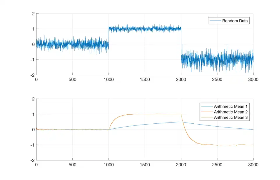 Nebenstehend ist exemplarisch das Verhalten der hier angegebenen Rekursions-Gleichungen, bei einem einfachen instationären, stochastischen Prozess (bereichsweise normalverteilt) zu sehen. Im Verlaufe der Zeit weisen der Erwartungswert sowie die Varianz der Zufalls-Daten ein sprunghaftes Verhalten auf. Die einfache Rekursionsgleichung ohne Vergessensfaktor (Arithmetic Mean 1) reagiert nur sehr träge auf das Verhalten des Datensatzes. Wohingegen die Rekursionsgleichungen mit Vergessensfaktor (Arithmetic Mean 2 & 3, ) deutlich schneller reagieren. Es fällt weiterhin auf, dass die Algorithmen mit Vergessensfaktor zu einem etwas größeren Rauschen führen. In diesem Beispiel sollte jedoch klar sein, dass die schnellere Reaktionszeit Vorrang hat. Die Ergebnisse „Arithmetic Mean 2“ und „Arithmetic Mean 3“ unterscheiden sich hier nur sehr gering voneinander. Je nach Datensatz, vor allem je nach Menge an Daten, kann dies deutlich anders aussehen.