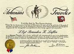 - Seit 1941 können in Arkansas Personen, die nicht Bürger des Bundesstaates sind, als Arkansas Traveler ausgezeichnet werden. Die Ehrung wird vom Gouverneur für Verdienste um den Bundesstaat Arkansas oder seine Bevölkerung vergeben. Die Ehrung des Empfängers erfolgt üblicherweise im Rahmen einer öffentlichen Veranstaltung, bei der dem Geehrten ein vom Gouverneur und vom Secretary of State des Bundesstaates Arkansas unterzeichnetes und mit dem Siegel von Arkansas versehenes Zertifikat im Format 11 ¼ × 15 ¼ Zoll übergeben wird. Zum ersten Arkansas Traveler wurde am 20. Mai 1941 Präsident Franklin D. Roosevelt ernannt;[46][47]