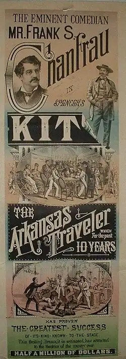 1866 schrieb der US-amerikanische Dramatiker Edward Spencer für den populären New Yorker Schauspieler Frank Chanfrau das Drama Down on the Mississippi. Das Leben des Protagonisten Jefferson gerät aus den Fugen, als ein Fremder seine Frau und seine Tochter entführt. Nach vielen Jahren der Suche findet der zu Wohlstand gekommene Jefferson seine Tochter wieder und kann den Fremden besiegen. Chanfraus Manager Thomas B. de Walden änderte das Stück, indem er die Geschichte des Arkansas Travelers als Prolog voranstellte und den Titel in Kit, the Arkansas Traveler änderte. Der Siedler Kit Redding wurde nunmehr zum Titelhelden und Reisenden, während der ursprüngliche Traveler zum Schurken wurde. Nach anfänglichem Misserfolg wurde das Bühnenstück äußerst erfolgreich und erlebte von 1870 bis zur Jahrhundertwende zahllose Aufführungen vor vollen Häusern, nach dem Tod Chanfraus im Jahr 1884 übernahm dessen Sohn Henry Chanfrau die Titelrolle. Für das US-amerikanische Genre des Border Drama ist Kit, the Arkansas Traveler einer der bedeutendsten Vertreter. Der Stoff wurde unter dem gleichen Titel 1914 verfilmt.[15][16]