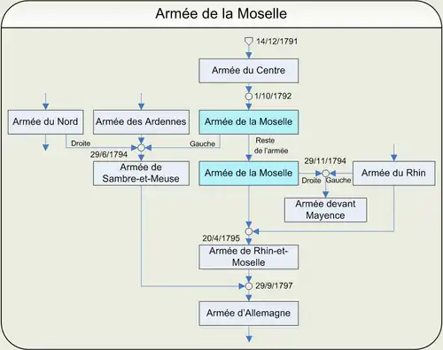 Die Armée du Centre, gebildet am 14. Dezember 1791 auf Befehl von König Louis XVI. wurde am 1. Oktober 1792 auf Anordnung des Nationalkonvents in „Armée de la Moselle“ umbenannt. Durch die Dekrete vom 1. März und vom 30. April 1793 wurde die Armee verstärkt.