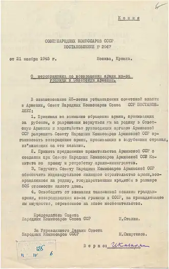 Armenier, die gemäß den Regelungen vom 21. Oktober 1945 in die Sowjetrepublik Armenien heimkehrten, erhielten mit dem Tage ihrer Ankunft wieder die Sowjetbürgerschaft.[29] Es soll knapp einhunderttausend Rückkehrer gegeben haben. Viele hatten prekär mit Nansen-Pässen vor allem in den Nachfolgestaaten des osmanischen Reichs gelebt. Etwa vierzigtausend kamen aus dem Iran (1941 bis Ende 1946 war dessen Norden sowjetisch besetzt). Oft konnten sie kein Ostarmenisch oder Russisch, was ihre Integration erschwerte. Es remigrierten aus der Sowjetunion 1956–1975 28.000 nach Frankreich und 1972–1976 6000 in die USA (letztere oft über den Nahen Osten).[30]