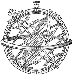 Die Armillarsphäre (lateinisch armilla „Armreif“, sphaera „Kugel“) ist ein astronomisches Gerät. Es ist zwischen der antiken Armillarsphäre (auch sphärisches Astrolab genannt) und der mittelalterlichen Armillarsphäre zu unterscheiden. Die antike Erfindung war ein Messgerät der Astrometrie, das heißt, dass damit die Position von Himmelskörpern vermessen wurde. Die mittelalterlichen Modelle wurden nur zur didaktischen Visualisierung des Himmels gebaut und hießen daher auch Weltmaschinen, mit denen die Bewegung der Himmelskörper dargestellt wurden. Sie wurden zuerst von arabischen Astronomen nach antiken Vorbildern angefertigt.[1] In Europa kamen sie jedoch erst in der frühen Neuzeit in Gebrauch.