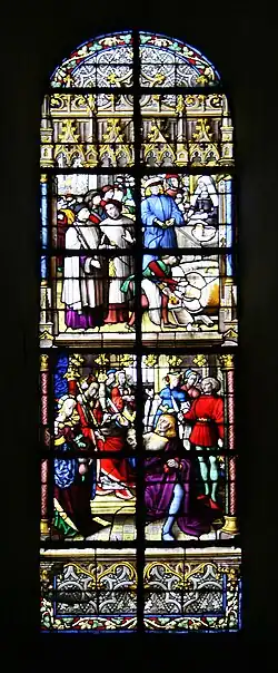 Der eine Zyklus schildert eine Abfolge von Ereignissen, die sich im 6. Jahrhundert begeben haben: Die Erzählungen im unteren Teil der Fenster zeigen die Niederlage von König Chilperic gegen seinen Bruder Sigebert, den Schutz von Chilperic durch den Bischof von Tournai und die Verschwörung und Ermordung von Sigebert durch Chilperics Frau, Königin Fredegund. In den oberen Abschnitten derselben Fenster sind verschiedene Aspekte der Besteuerung und der Erhebung von Zöllen durch den Klerus der Kathedrale von Tournai dargestellt.[3]