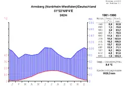 Die Jahresmitteltemperatur in Arnsberg betrug 8,4 °C und es fällt pro Jahr durchschnittlich eine Niederschlagsmenge von 1029 Liter pro Quadratmeter.