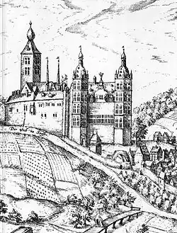 In den ersten Jahrhunderten der Kurkölner Herrschaft blieb auch die Residenzfunktion relativ schwach ausgeprägt. Das änderte sich erst, als am Ende des 16. Jahrhunderts die Burg in mehreren Bauabschnitten in ein repräsentatives Schloss umgewandelt wurde.[12] Dieses wurde während des Siebenjährigen Krieges im Jahr 1762 durch Kanonenbeschuss zerstört und ist seither eine Ruine.[13] Auch die Stadt selber wurde dabei weitgehend zerstört. Damit endete auch die kurze Hochzeit als Residenzstadt wieder, wenngleich Arnsberg weiterhin politisches Zentrum des Herzogtums Westfalen blieb. In diesem Zusammenhang wurde 1784 ein Zuchthaus aus den Steinen des zerstörten Schlosses erbaut. Im Jahr 1799 wurden durch Brand erneut Teile der Stadt in Mitleidenschaft gezogen. Ein Plan zum Wiederaufbau sah danach eine geänderte Bebauung vor. An die Stelle der engen Gassen traten breitere Straßen.