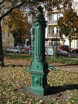 Der im Bereich an der Bötzowstraße liegende Teil des Platzes lädt mit alten Bäumen, vor allem Kastanien, und mit Bänken zum Verweilen, mit geschnittenem Rasen zum Liegen oder nur zu einem kurzen Bummel ein. Ein Teil der Bäume stammt noch aus 1902 dem Jahr der ersten Platzgestaltung.[13] Als Straßenmöbel steht hier eine alte gusseiserne Handpumpe der Art, wie sie hin und wieder auf den Berliner Straßen anzutreffen sind.