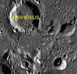 Arrhenius hat einen mit J bezeichneten Nebenkrater. Der ehemalige Nebenkrater P ist im Jahre 2006 umbenannt worden.[1]
