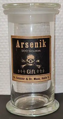 Das weiße Arsenoxid Arsenik ist seit langem als Mordgift berüchtigt. Seit der Spätantike war es das mit Abstand am meisten verwendete Gift. Die ironische französische Bezeichnung poudre de succession („Erbschaftspulver“) für Arsenik leitet sich von dieser Verwendung als Gift ab, ebenso die deutsche Bezeichnung „Altsitzerpulver“. Viele historische Giftmischungen wie zum Beispiel Aqua Tofana enthielten als wesentlichen Bestandteil Arsenik. Durch regelmäßige Einnahme geringer Mengen gewöhnt sich der menschliche Organismus zwar nicht an das Gift, aber die Aufnahme über die Schleimhaut wird deutlich verringert (sogenannte Arsenikfestigkeit) und die minimale tödliche Dosis wird höher, so dass orale Dosen toleriert werden, die für andere tödlich wären. Einige Herrscher haben deshalb auch regelmäßig geringe Mengen an Substanzen wie Arsenik eingenommen, um sich gegen Giftmordanschläge zu schützen (Mithridatisation). In alten lateinischen Texten wird ein Mordanschlag auf einen Fürsten, wenn man Blutvergießen vermeiden wollte, als coniuratio pulveraria, also „eine Verschwörung mit Giftpulver“, bezeichnet.[9] Ein solcher Anschlag wurde beispielsweise 1590 auf Markgraf Jakob III. von Baden-Hachberg verübt.