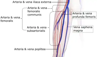 Die Arteria femoralis[2] (Oberschenkelarterie) ist als Fortsetzung der Arteria iliaca externa die Arterie zur Versorgung des Beins. Sie gibt kurz unter dem Leistenband die etwa gleich starke Arteria profunda femoris ab, die in die Tiefe abbiegt und die hauptsächliche Versorgung des Oberschenkels leistet. Bei den Haustieren geht die Arteria profunda femoris bereits aus der Arteria iliaca externa ab. Die A. femoralis selbst bleibt relativ oberflächlich und zieht gerade weiter zum Unterschenkel.