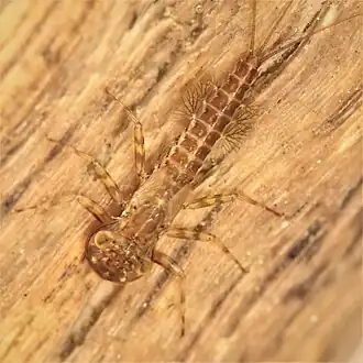 Die Larven weisen als eigentümliche Sonderbildung stark verlängerte und behaarte Maxillarpalpen auf, die den Kopf halbkreisförmig umgeben, diese sind etwa doppelt so lang wie die Kopfbreite. Sie erzeugen beim lebenden Tier durch schnelle Bewegung eine Wasserströmung und dienen als Filterapparat zum Ausfiltrieren von Nahrungspartikeln, überwiegend Algen. Die kleinen Larven sind recht dunkel gefärbt, der Körper ist hoch gewölbt, aber der Kopf abgeplattet. Am Hinterleib sitzen sieben Paar dreieckig bis herzförmig geformter Kiemenblättchen. Die drei Schwanzfäden besitzen etwa gleiche Länge.
