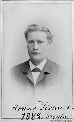 Arthur Krause wurde 1851 auf dem Gutshof seines Vaters August Krause in Polnisch Konopath in Westpreußen geboren. Er hatte mehrere Brüder und Schwestern. Der ältere Bruder Albert (1841–1913) wanderte in die USA aus, nahm am Sezessionskrieg teil und wurde Ende der 1880er Jahre City Engineer von Buffalo.[1] In dieser Funktion führte er die erste Vermessung der Niagara-Fälle durch.[2] Besonders enge Beziehungen hatte Arthur aber zu seinem zwei Jahre älteren Bruder Aurel. Beide besuchten das Gymnasium in Bromberg bis zum Abitur, studierten in Berlin die Naturwissenschaften und wurden anschließend Lehrer an der Luisenstädtischen Gewerbeschule. Arthur unterrichtete Chemie, Mineralogie, Botanik und Zoologie, aber auch Mathematik, Physik und Französisch. In den Schulferien unternahmen die Brüder ausgedehnte Reisen, unter anderem nach Italien, Dalmatien und Norwegen. Arthur Krause gehörte dem Lehrkörper bis zum 1. April 1919 an. 1878 promovierte er an der Friedrichs-Universität Halle-Wittenberg zum Dr. phil.
