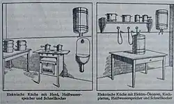 In Zusammenhang mit der landesweiten Elektrifizierung experimentierte Arthur Schönberg gern mit technischen Lösungen für den Alltag der Menschen, wie zum Beispiel der Einführung von elektrischen Haushaltsgeräten zum Kochen und Backen. Im Oktober 1927 berichtete er erstmals über „Versuche zur Einführung der Elektrowärme im Haushalt“.[14] In einem Pilotprojekt mit den kommunalen Elektrizitätswerken in Schweinfurt und Schwandorf wurden elektrische Prototypen für die Küche erprobt, Kochherde mit zwei und drei Platten, Brat- und Backrohr und Schnellkocher.[15] Schönberg ging es bei seinem Bemühen um die Einführung elektrischen Kochens auch darum, Menschen mit niedrigerem Einkommen daran zu beteiligen. An den Stadtrat von Schwandorf schrieb er im Dezember 1927: „Wir hoffen, dass hierdurch namentlich auch die minderbemittelte Bevölkerung Gelegenheit zum ausgiebigeren Wärmestromverbrauch erhalten wird.“[16]