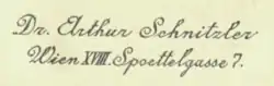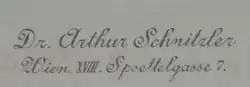 | „Dr. Arthur Schnitzler / Wien, XVIII. Spoettelgasse 7.“ | September 1905[19] | Januar 1906[20] | Auf Briefpapier, Briefkarte, Briefkuvert gedruckt | ![]() |