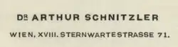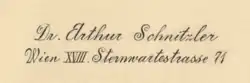 | „Dr. Arthur Schnitzler / Wien XVIII. Sternwartestrasse 71“ | 10. September 1910[23] | August 1918[24] | Auf Briefpapier, Briefkarte gedruckt | ![]() |