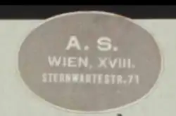 | „A. S. / Wien, XVIII / STERNWARTESTR. 71“ | Mai 1923[31] | zumindest Februar 1931[32] | Ovaler Adresskleber, weiß auf braunem Hintergrund | ![]() |
