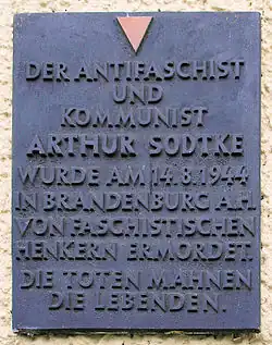 Nach der Hinrichtung wurde sein Leichnam im Krematorium Brandenburg verbrannt. Im Jahr 1946 wurden zahlreiche Urnen mit der Asche von in der Zeit des Nationalsozialismus hingerichteten Widerstandskämpfern aus den damaligen Berliner Bezirken Lichtenberg, Kreuzberg und Prenzlauer Berg auf den Zentralfriedhof Friedrichsfelde überführt, von denen besonders viele im Zuchthaus Brandenburg-Görden enthauptet worden waren. Ihre sterblichen Überreste fanden schließlich in der 1951 eingeweihten Gedenkstätte der Sozialisten (Urnensammelgrab bei der großen Porphyr-Gedenktafel auf der rechten Seite der Ringmauer) ihren endgültigen Platz. Neben Arthur Sodtke[3] erhielten auf diese Weise auch viele andere Widerstandskämpfer eine würdige Grabstätte und einen Gedenkort.[4]