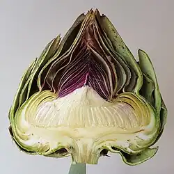 Bei großen Artischocken sind die unteren fleischigen Teile der Hüllblätter und die Blütenböden (eigentlich Korbböden; das Artischockenherz) essbar.[6] Die unter den Blättern liegenden Härchen, das so genannte „Heu“ (nicht geöffnete Blüten), sind nicht zum Verzehr geeignet. Kleinere Artischockensorten, die überdies früh geerntet werden (wie es z. B. auf der Gemüseinsel Vignole in der Lagune von Venedig üblich ist), können im Ganzen verzehrt werden, darunter auch die mit dem Siegel der geschützten geografischen Angabe (g. g. A.) versehene, dornenlose Römische Artischocke (carciofo romanesco).[7] Die ganzen Blütenköpfe werden gebraten, gekocht oder frittiert. Der feine Geschmack der ungewürzten gekochten Artischocke ähnelt dem des Eiweißes eines Spiegeleis. Artischocken werden 20 bis 45 Minuten in Salzwasser mit etwas Zitronensaft gekocht. Die Blätter werden dann abgezupft und der untere Teil mit den Zähnen abgezogen. In der Regel wird dazu eine Vinaigrette gereicht. Artischockenböden werden auch eingelegt und sind unter anderem ein verbreiteter Pizzabelag.