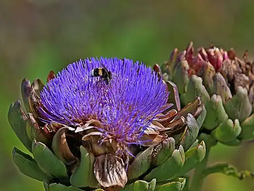 Die körbchenförmigen Blütenstände sind der Teil der Pflanze, der geerntet wird. Im Vergleich zu wild wachsenden Formen sind die Blütenstände größer. Durch eine frühere Blütezeit sind mehrere Ernten im Jahr möglich. Der Blütenstandsboden ist stark fleischig. Die unten fleischigen, dachziegeligen Hüllblätter sind bei kultivierten Formen kaum dornig. Werden die Blütenstände nicht geerntet, zeigen sich die violetten Röhrenblüten. Es werden 2 bis 8 Millimeter lange Achänen mit einem Pappus aus 2 bis 3,5 Zentimeter langen, federigen Borsten gebildet.