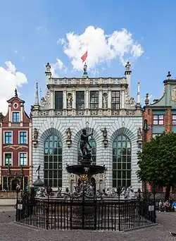 Die prächtige Fassade des Artushofs am Langen Markt erfuhr 1552 einen Umbau im Renaissancestil und erneut 1616/1617 durch den Architekten Abraham van den Blocke eine manieristische Umgestaltung. An der neuen Front blieben die drei gotischen Fenster erhalten. Das Bauwerk erhielt eine Attika und ein neues Portal. Es wurden an den Fenstern Skulpturen von Scipio Africanus, Themistokles, Marcus Furius Camillus, sowie Judas Makkabäus angebracht, die die Tugenden der Bürgerschaft symbolisieren. Allegorische Statuen der Gerechtigkeit, Tapferkeit und des Glücks zieren die Nischen der Attika und den Giebel. Der Artushof in Danzig war ab 1742 Sitz der Danziger Börse.