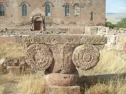 Unmittelbar südlich der Kirche befand sich der Palast des Grigor Mamikonjan. Er bestand aus einer großen Empfangshalle mit zwei Reihen von je drei Säulen, einer weiteren Halle westlich angrenzend und einer Galerie. Im Grundplan ähnelt er dem Palast des Katholikos in Dvin. Nach der Meinung von Historikern beauftragte Grigor seinen Architekten, den dortigen Palast nachzubauen. Die Empfangshalle, von der mehrere Lagen der Außenmauern restauriert wurden, besaß im Osten einen Thronsaal. In diesem Bereich sind zwei hier gefundene Kapitelle mit mächtigen seitlichen Trommeln aufgestellt. Sie tragen Reliefs mit einer Rosette aus gerollten Palmblättern sowie geometrische Ornamente an den Abaki. Eines der Kapitelle stellt die Kopie eines in Dvin aufbewahrten Kapitells dar. Die Säulenschäfte bestanden laut Jean-Michel Thierry (1988) aus Holz, nach den durch die Ausgrabungen von 2006/07 gewonnenen Erkenntnissen waren sie aus Stein.[18] Die Decke wurde aus Holzbalken geschichtet, vermutlich in der Art eines Kraggewölbes (armenisch hazaraschen), wie bis ins 20. Jahrhundert die Dächer traditioneller armenischer Wohnhäuser mit einer Rauchöffnung (jerdik) in der Mitte konstruiert waren. Der Thron ist der einzige bekannte seiner Art in Armenien. Erhalten blieb eine 1,3 × 1,6 Meter große Basis aus Tuffsteinen.