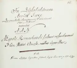 - ↑ Pehr Cederhamn, Carl von Linné: Catalogus dissertationum, quae ad illustrandas Res Svecicas faciunt, praesertim in argumentis historicis, ecclesiasticis, juridicis, literariis, oeconomicis, physicis, & historia naturali.. Literis & impensis direct. Laur. Salvii, 1765, S. 54 (google.de).