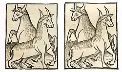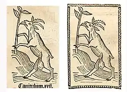 | 028r[7] | Blut vom Geißbock | A Harnwegs-Stein und -Grieß. ----- A = Gart der Gesundheit. Mainz 1485, Kapitel 142[8] | Capra spec. | ![]() |
