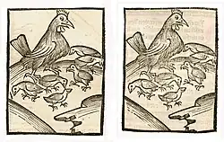| 069r[18] | Hahn, beschnittener (kappen) | A Kräftigung von Körper und Geist - B Appetitanregend, stärkt den Leib, treibt Sucht vom Herzen - C Macht ein lauteres Angesicht. ----- A, B = Gart der Gesundheit. Mainz 1485, Kapitel 211[19] ----- A = Heidelberg. Cpg 226. Elsass 1459-1469, Blatt 105r[20] | Gallus gallus domesticus | ![]() |