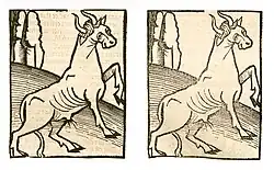 | 091r[16] | Galle des Rindes (rinds gallen) | A Fell und Flecken der Augen - B Panaritium am Finger (ungenannter Wurm). ----- A = Heidelberg. Cpg 226. Elsass 1459-1469, Blatt 104v[17] | Bos primigenius taurus | ![]() |
