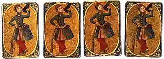 - ↑ M. Roschanzamir, „Persische Lackmalerei auf As-Spielkarten“, Mitteilung aus dem Museum für Völkerkunde (Hamburg), N.S. 16, 1986, S. 71–90.