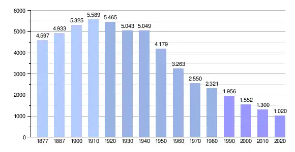 Nach einem Anwachsen der Gemeindegröße mit einem Höhepunkt zu Beginn des 20. Jahrhunderts mit etwas über 5000 Einwohnern sank die Zahl der Bevölkerung stetig bis nahe 1000. Ein markanter Rückgang zeigt sich zwischen 1950 und 1960, als die Gemeinde allein in dieser Dekade ungefähr 28 % seiner Bewohner verlor.