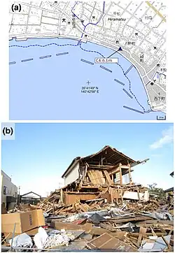 - ↑ Yoshinobu Tsuji, Kenji Satake, Takeo Ishibe, Tomoya Harada, Akihito Nishiyama, Satoshi Kusumoto: Tsunami Heights along the Pacific Coast of Northern Honshu Recorded from the 2011 Tohoku. In: Pure and Applied Geophysics. Band 171, Nr. 12, 2014, S. 3183–3215, doi:10.1007/s00024-014-0779-x. (Online veröffentlicht am 19. März 2014). Lizenz: Creative Commons Attribution 4.0 International (CC BY 4.0). Hier: S. 3194, Figure 13.