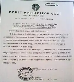 Nach dem Zweiten Weltkrieg bemühte sich die Führung der Armenischen SSR, Armenier aus der Diaspora nach Sowjetarmenien zu holen. Zehntausende Armenier aus Syrien (darunter auch die Familie des späteren Präsidenten Lewon Ter-Petrosjan), Irak und Iran folgten bis Anfang der 1950er Jahre dem Ruf. 1947 gelang es Grigor Harutjunjan, dem Ersten Sekretär der KPdSU in der Armenischen SSR, den Ministerrat der UdSSR davon zu überzeugen, durch Umsiedlung von Aserbaidschanern aus Armenien nach Aserbaidschan Siedlungsraum für die Neuankömmlinge in Sowjetarmenien zu schaffen. Der Ministerrat beschloss einen „Erlass über die Umsiedlung von Genossenschaftsbauern und anderer aserbaidschanischer Bevölkerung aus der Armenischen SSR in die Kura-Aras-Niederung der Aserbaidschanischen SSR“ (Указ о переселении колхозников и другого азербайджанского населения из Армянской ССР в Кура-Араксинскую низменность Азербайджанской ССР).[33] Auf Grundlage des Erlasses wurden in den Jahren von 1948 bis 1951 etwa 100.000 Aserbaidschaner aus Armenien auf „freiwilliger Basis“ nach Zentral-Aserbaidschan umgesiedelt.[34][30] Heute wird die Umsiedlung von offiziellen aserbaidschanischen Stellen als zwangsweise „Deportation“ bezeichnet.[35][36][37] Die Anzahl der Aseris in Sowjetarmenien betrug danach laut offizieller Volkszählung von 1959 nur noch 107.748.[38] In Jerewan machten die Aseris 1959 nur noch 0,7 % der Bevölkerung aus.[36] Laut Zensus von 1979 lebten aber wieder 160.841 Aseris, 5,3 % der Bevölkerung, in Sowjetarmenien.[39] So bildeten die Aserbaidschaner in Armenien in den 1980er Jahren die stärkste ethnische Minderheit der Armenischen SSR.[40]