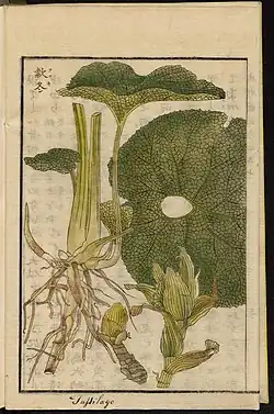 - ↑ Petasites Japonicus im Germplasm Resources Information Network (GRIN), USDA, ARS, National Genetic Resources Program. National Germplasm Resources Laboratory, Beltsville, Maryland.