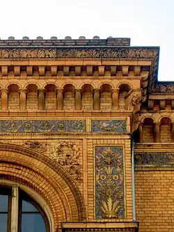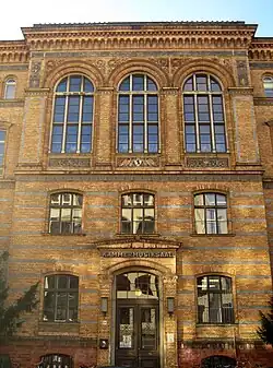 Das nördliche Gebäude weist eine 47 Meter lange, symmetrische Front aus gelbem Ziegelstein auf, aus der ein risalitartiger Mittelteil mit abermals abgesetztem, von Säulen flankiertem Portal hervortritt. Die Fassade wird horizontal gegliedert durch dunkle Ziegelbänder im Erdgeschoss und im ersten Stock, Stichbogenfenster vom Erdgeschoss bis zum zweiten Stock, Paare von Rundbogenfenstern im dritten Stock und Gesimse über Erdgeschoss und erstem Stock. Hohe Rundbogenfenster im Mittelteil weisen den Sitz der Schulaula aus. Die Front wird abgeschlossen durch Ornamentfriese auf blauer Grundierung unter einem hohen Steingeländer mit auskragendem Kranzgesims.