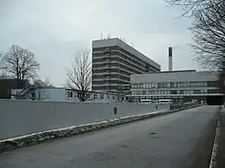 Aufschrift "AK Wandsbek" am Bettenhaus, noch aus der Zeit, als die Stadt Hamburg Besitzer der Klinik war