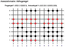 Eine Assoziativmatrix ist ein Assoziativspeicher mit einem Aufbau, der sich als Matrix oder in Form eines Gitters bestehend aus Zeilen- und Spaltenleitungen darstellen lässt. An den Kreuzungspunkten der Zeilen- und Spaltenleitungen kann ein Kontakt hergestellt werden, was in Matrixdarstellung dem Eintragen einer 1 an der zugehörigen Matrixposition entspricht. Frage-Antwort-Paare werden in die Assoziativmatrix durch eine Lernregel eingetragen, die es ermöglicht, dass der Speicher fehlertolerant und ähnlichkeitserhaltend abgefragt werden kann.[1][2][3]