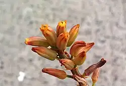 Der Blütenstand ist eine lockerblütige Traube von 14 bis 30 Zentimetern Länge. Die aufrechten, grünlich braunen Blüten stehen an 3 bis 6 Millimeter langen Blütenstielen und besitzen gelbliche Zipfel. Die gerade Perigonröhre ist 8 bis 11 Millimeter lang und weist einen Durchmesser von etwa 3 Millimeter auf. Ihre Zipfel weisen eine Länge von etwa 2 Millimeter auf.