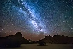 Der Astrotourismus im Rahmen der Amateurastronomie spielt sich in Namibia auf mehreren sogenannten Astrofarmen und auf der Internationale Amateur-Sternwarte (IAS) am Gamsberg im Rahmen von Gästesternwarten ab. Unweit der IAS befindet sich die Astrofarm Hakos mit dem Vehrenberg-Observatiorum und dem Hakos-Observatorium.[14] Auf der Astrofarm Tivoli südöstlich der Hauptstadt Windhoek am Rande der Kalahari befinden sich zahlreiche Observatorien.[15] 150 Kilometer südöstlich von Windhoek liegt die Astrofarm Kiripotib, die sich auf die Astrofotografie spezialisiert hat.[16] Das vierte Projekt wurde Mitte 2019 von dem Unternehmen DeepSkySafaris[17] gegründet. In Kooperation mit der Rooisand Desert Ranch[18], 180 km südwestlich von Windhoek, stehen für Amateurastronomen zahlreiche Teleskope für die Himmelsbeobachtung zur Verfügung. Auf der Onjala Lodge nordöstlich von Windhoek befinden sich das Onjala Observatory und das Chamäleon Observatory.[19]
