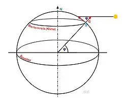 Astronomische Breite = Polhöhe = Winkelabstand des Zenits von Äquator (Sonne hier im Himmelsäquator gezeichnet)