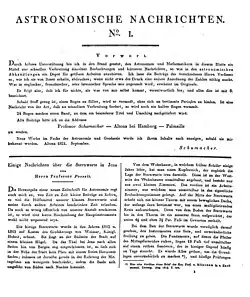 Im Juni 1821 unterrichtete Schumacher die Öffentlichkeit in einem Zirkular über seine Absicht, die Astronomischen Nachrichten herauszugeben:[3]