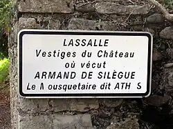 - Überreste des Schlosses von Armand de Sillègue. Ein Schild bei den Mauerresten weist darauf hin, dass Armand de Sillègue an dieser Stelle gelebt haben soll. Unklar ist allerdings, ob er in dem ehemaligen Schloss von La Salle auch geboren wurde, im Haus Moliède in Athos-Aspis oder aber in Autevielle, wo sein Vater ebenfalls Lehnsherr war. Armand de Sillègue d’Athos d’Autevielle ist weniger für sein reales Leben berühmt denn als Vorlage für die fiktive Figur des „Athos“ in Alexandre Dumas’ Roman „Die drei Musketiere“. Die reale Person ist etwa um 1615 geboren und trat 1640 als Musketier in die Garde des französischen Königs ein. Im Gegensatz zur Romanfigur verstarb er bereits drei Jahre später.[11]
